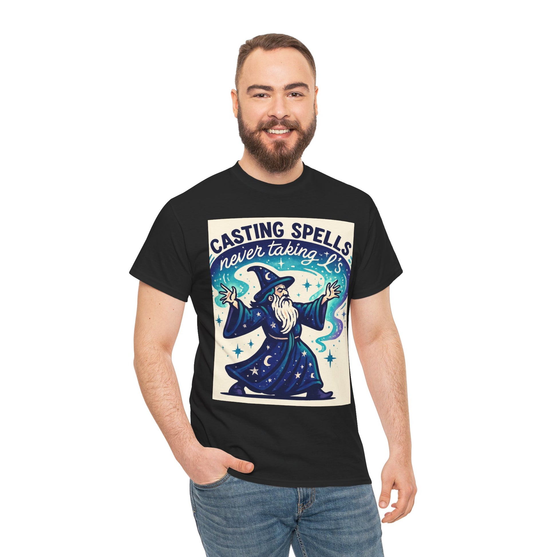 Why take losses when you can take loot? The Casting Spells, Never Taking L’s tee channels the confidence of a wizard who’s mastered the art of winning in style. Designed in a bold, vintage fantasy aesthetic with swirling spell energy and cosmic hues, it’s equal parts charm and chaos.