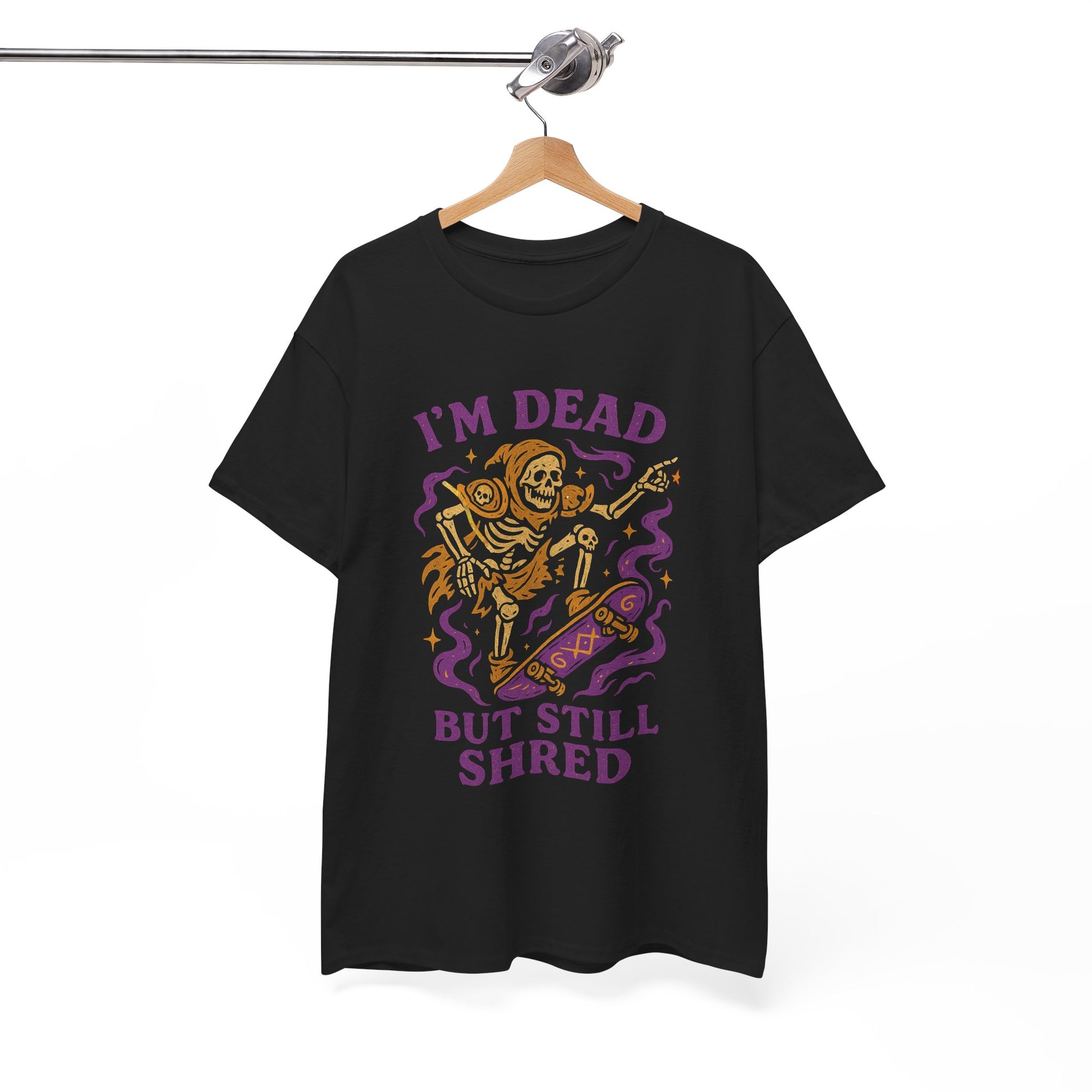 The I’m Dead But Still Shred Heavy Cotton Tee fuses dark humor with skate-ready attitude. Featuring a golden skeleton catching air on a purple skateboard, this bold design mixes vintage grit with modern streetwear energy. Made from 100% heavyweight cotton, it’s built for comfort, durability, and standout color that lasts through every wash.