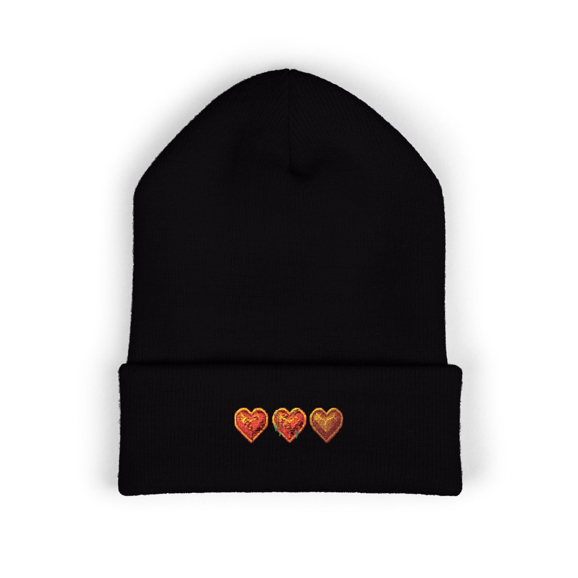 For the heroes who keep respawning. The Dungeon Hearts Classic Cuffed Beanie features embroidered pixel hearts in vivid red, corrupted green, and weathered gold—symbols of life, loss, and the grind that never ends.