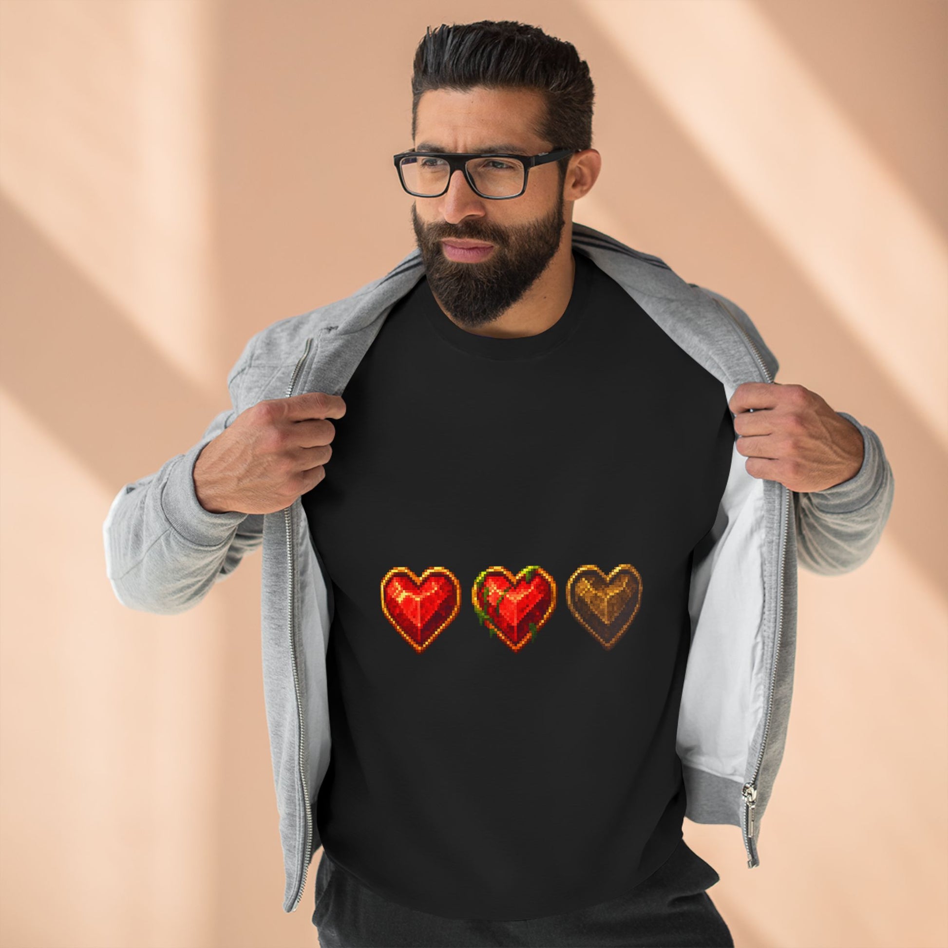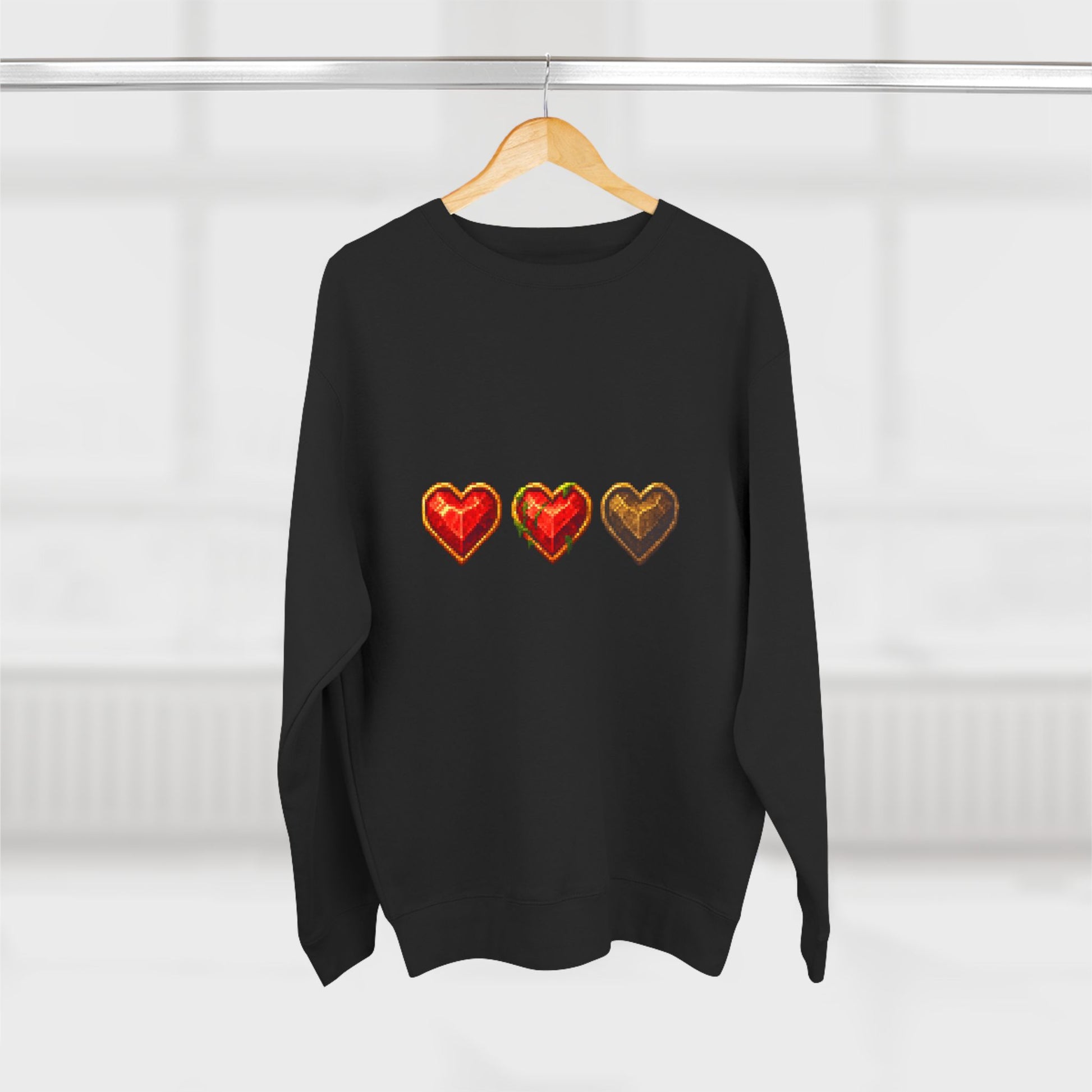 The Dungeon Hearts Crewneck Sweatshirt blends classic retro style with all-day comfort. Featuring a bold pixel heart design inspired by vintage adventure games, this sweatshirt is crafted from a durable cotton-poly blend that’s soft on the inside and structured on the outside. The ribbed cuffs and waistband hold their shape through repeated wear, while the heavy fabric weight keeps you warm without feeling bulky.