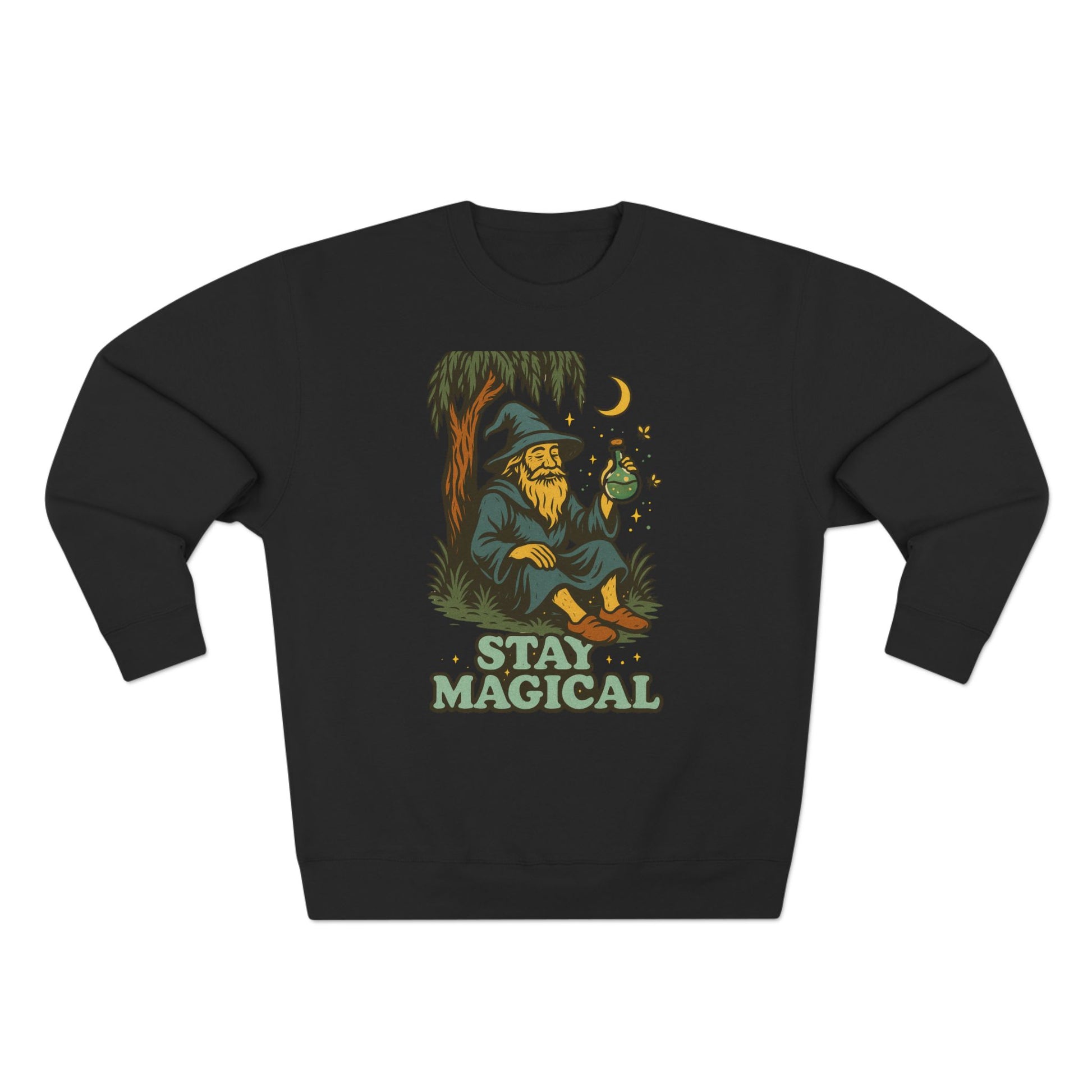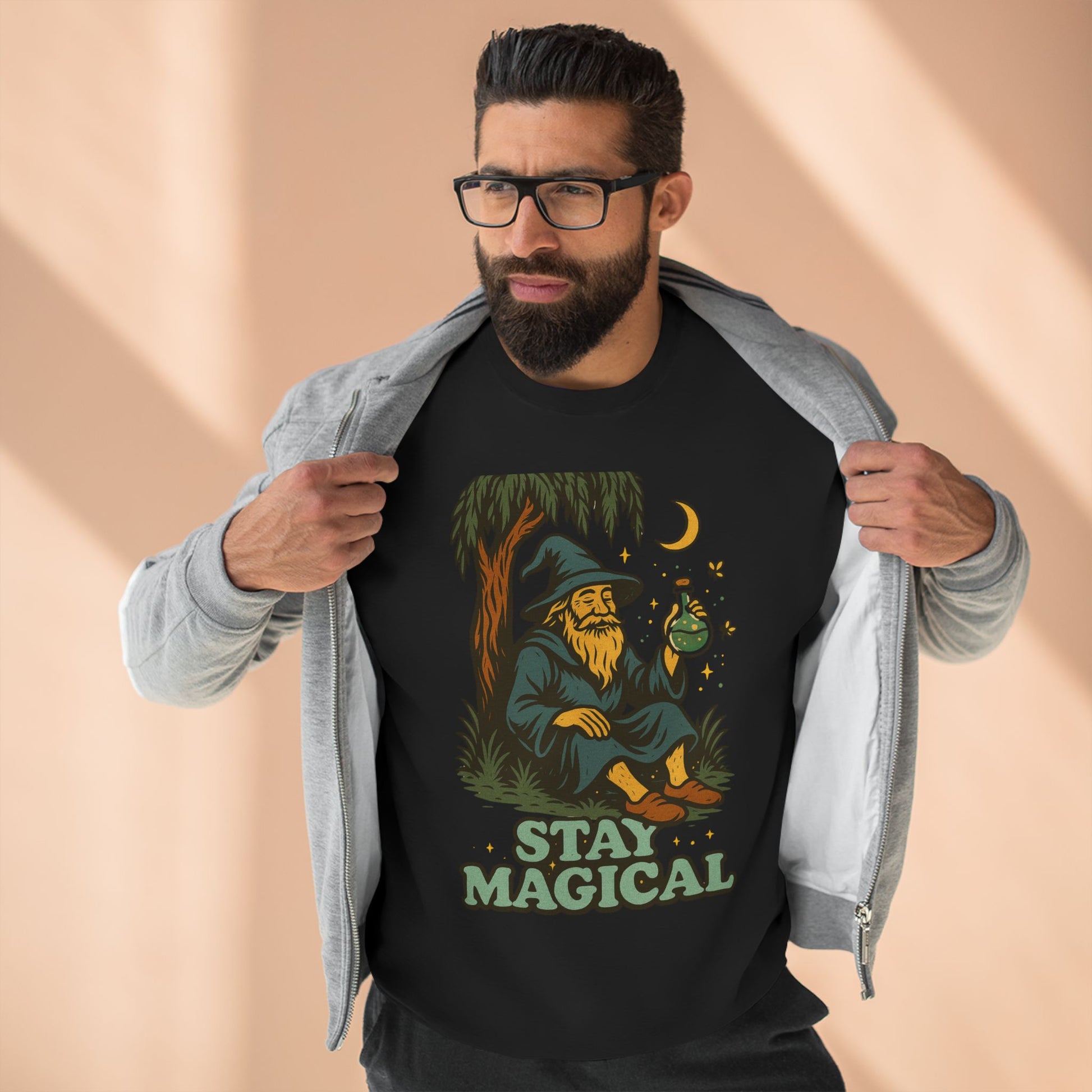 When the world gets loud, find your calm under the willow. This vintage-style sweatshirt features a laid-back wizard resting beneath the moonlight, potion in hand, radiating pure serenity. With muted tones of forest green, gold, and midnight blue, it’s a soft tribute to slowing down, breathing deep, and keeping your spark alive.